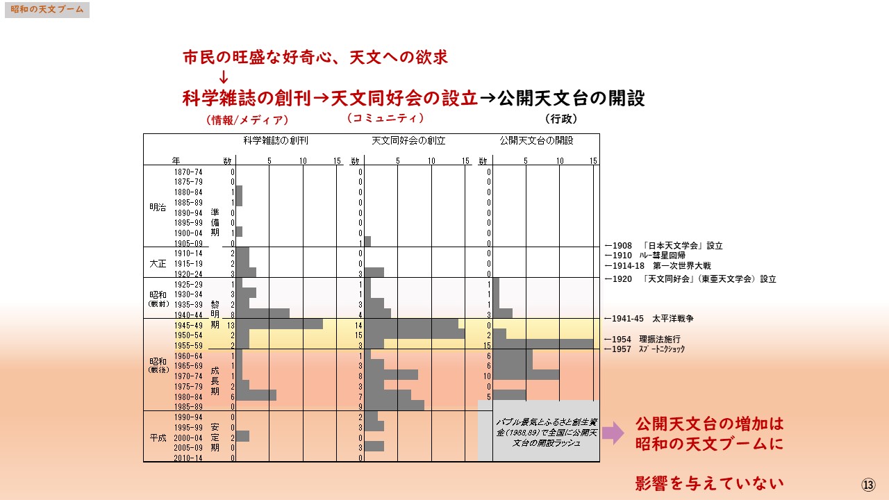 ここで、昭和の天文ブームを1945(S20)~1986(S61)、前半1945(S20)~1956(S31)を成長期、1957(S32)~1986(S61) を全盛期。ブーム前を胎動期、ブーム後を衰退期とし、現状と比較する。