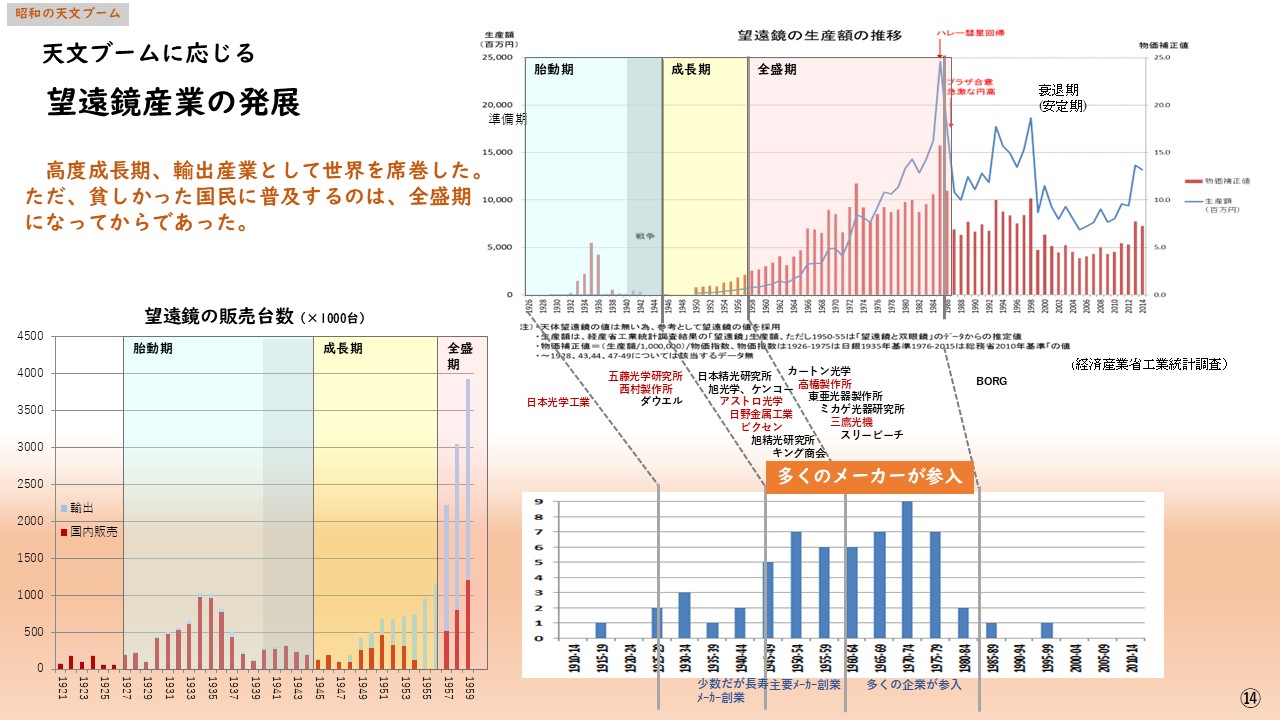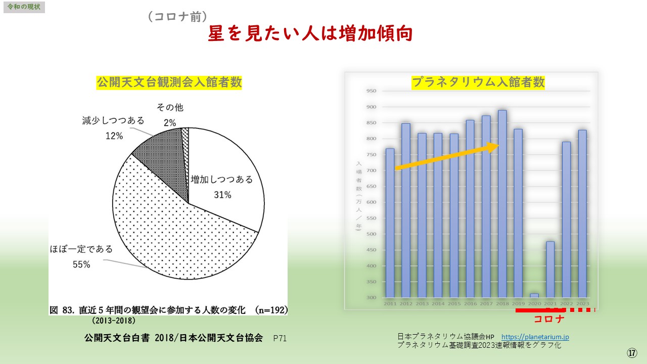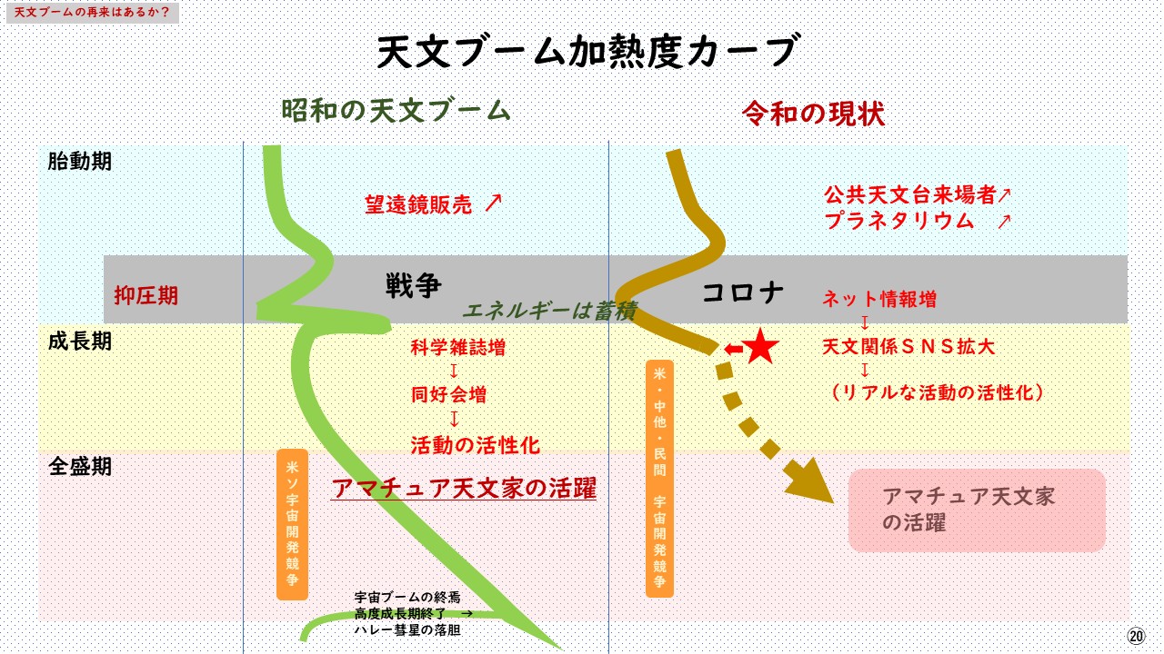 今を比較すると、背景とした世情や大衆の意識は大きく変わった。ただ、ロックダウン等パンデミックから解放された社会。米中、民間を含めた宇宙開発競争が行われ、ジェームズウェップ望遠鏡やアロマ望遠鏡等により新しい情報が次々ともたらされている状況は酷似し、その上、すでに燃料は投下されている。また望遠鏡販売やプラネタリウム来場者等も右上がりの傾向を示し、天文ブームの準備は整い、胎動期から成長期へのステップアップは近いと判断する。
