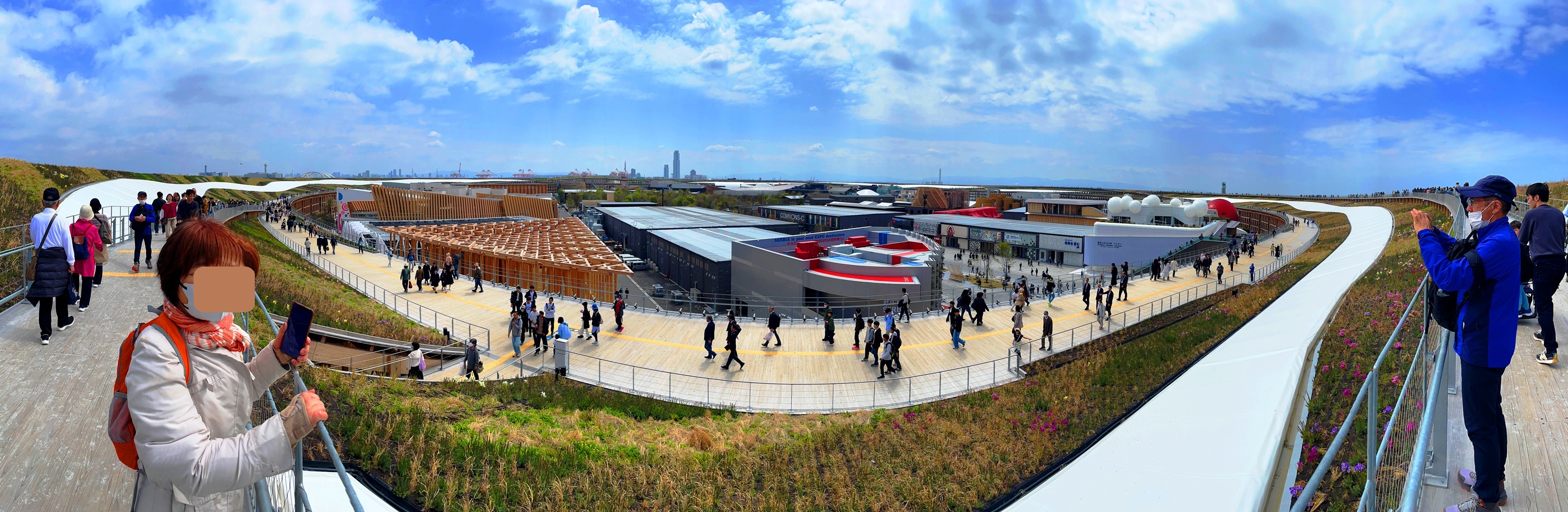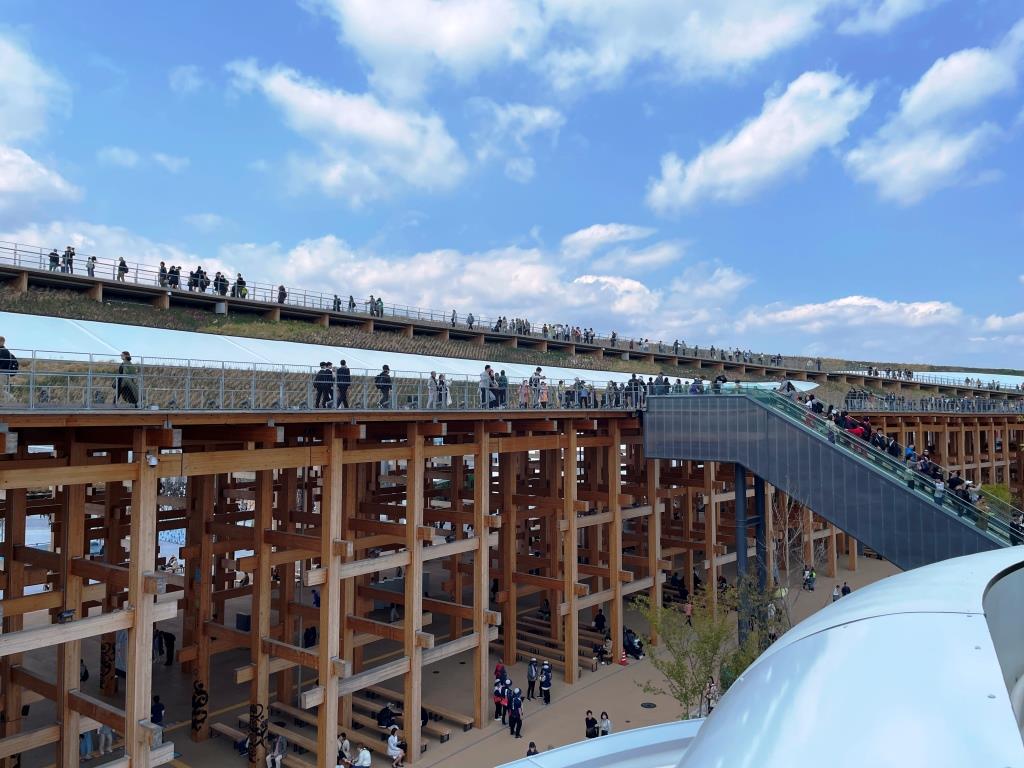 だいたいこういうイベント会場は立ってるだけでヘロヘロになりますが、大屋根リングの下にたくさんのベンチがあり、これからの暑さには重宝するものと思います。コンセプトに準じたケアがされているようです。