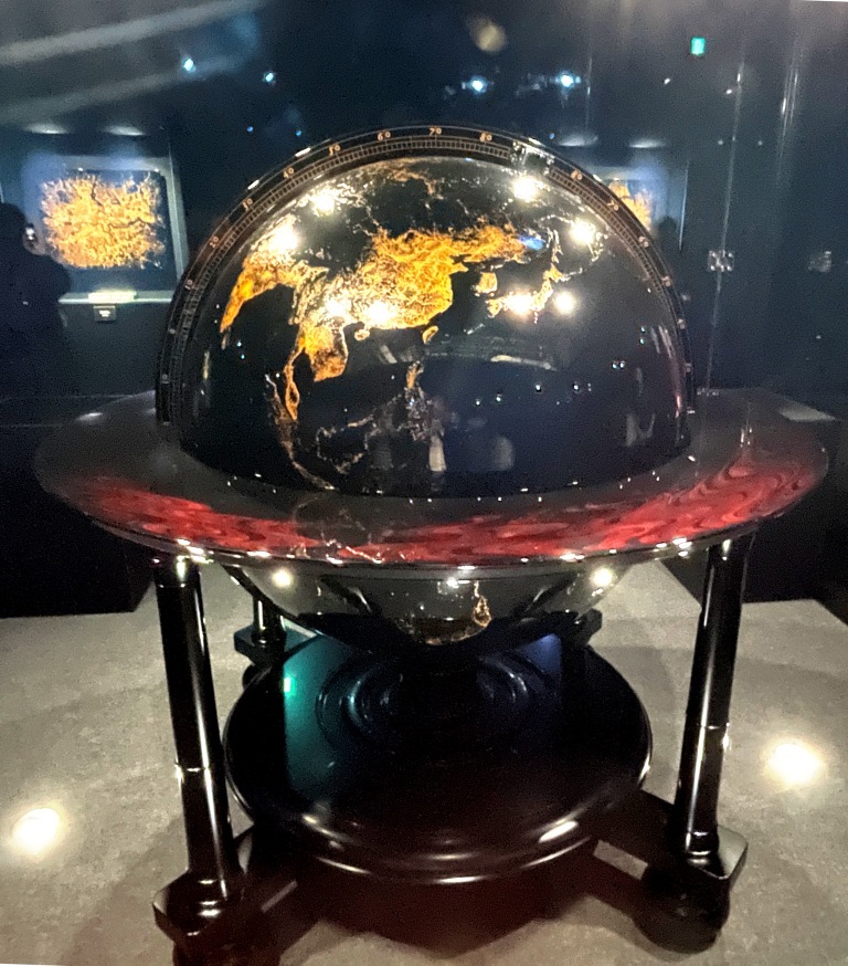 輪島塗の地球儀は、ふだんは輪島市の石川県輪島漆芸美術館に展示されていて、去年の能登半島地震では奇跡的に被害を免れて持ってこられたようです。地球儀自体は木でできていて、その製造工程のビデオが良かったです。
