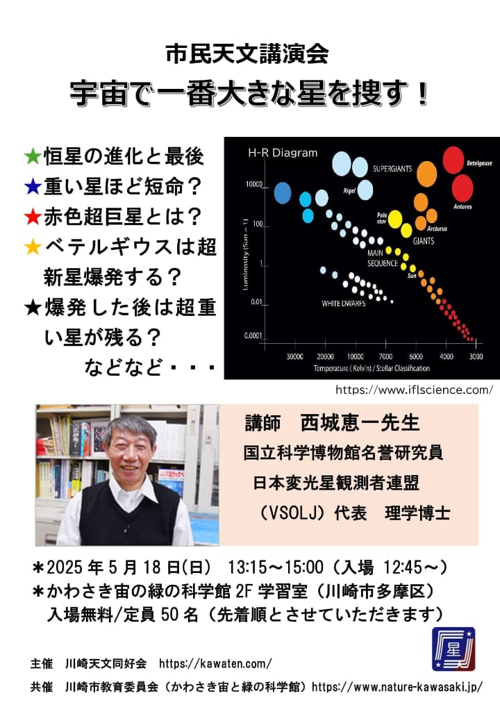 私が所属します川崎天文同好会の市民天文講演会(兼総会)を下記のとおり開催します。