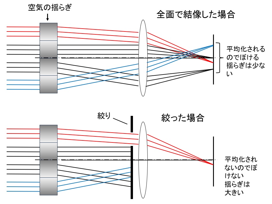 集光力が大きいので露光時間が短くなり空気の揺らぎによる像変化が時間的に平均化されず
