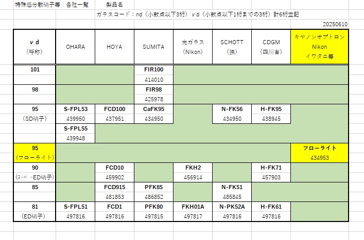 吉田正太郎氏の本には蛍石(フローライト)よりももっと色分散の小さい結晶として、フッ化リチウム(νd=97.3、ガラスコード:392973)が挙げられていますが、今回の一覧表で解るように現在既にフッ化リチウムを超える硝子は開発済で販売されている訳です。