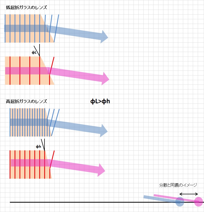 同じ屈折率で違う分散のガラスの違いのイメージがわきません。