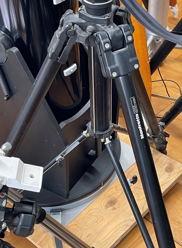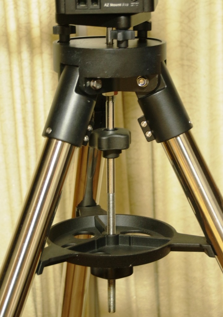 台座が広く、台座にカメラ用三脚の様に開き止めがあり、開けて置くだけで安定するのですが、望遠鏡固定ネジが三脚台座を貫通し、その寸切りボルトを利用し、中からプレートで押し上げることで三脚を押し、開き止めとケンカさせて固定します。これだと、プレートが足の3方向に回転対称なら、中央から同じ力で押します。今は、スカイウォッチャー他もこのタイプを使っています。ミラーやレンズの光軸調整の押しねじ/引きネジと同じと考えてもいいかもしれません。