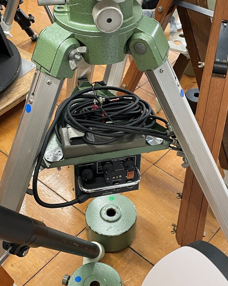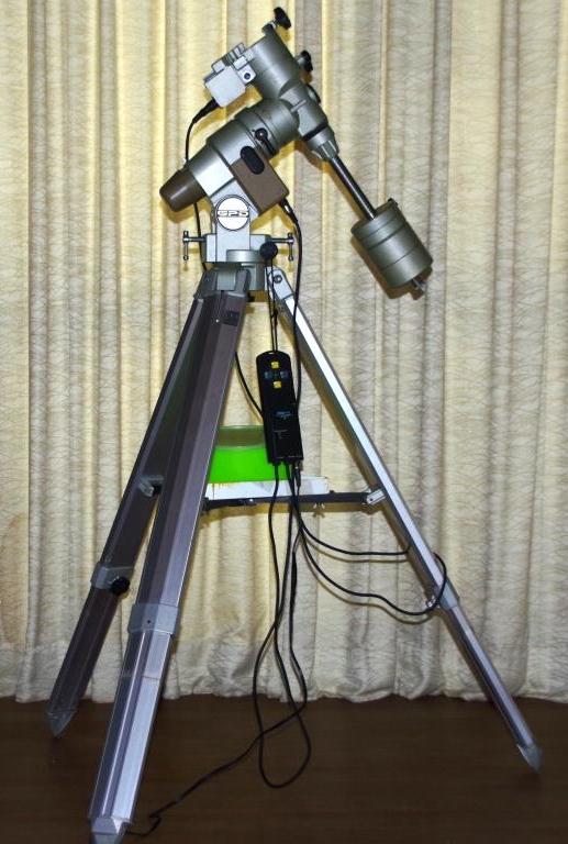 すいません。写真で見せたので型式ハショッてしまいました。i-Optron AZマウントProという経緯台で、GPSと半自動アライメントで精度よく導入できるもので、現行モデルでも水平出し機能がついています。