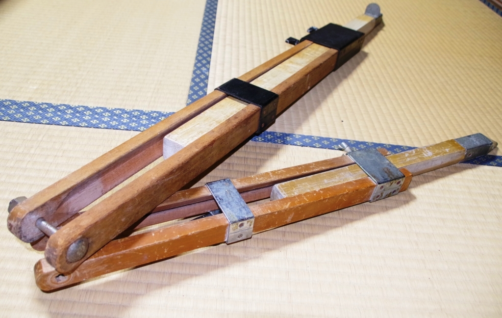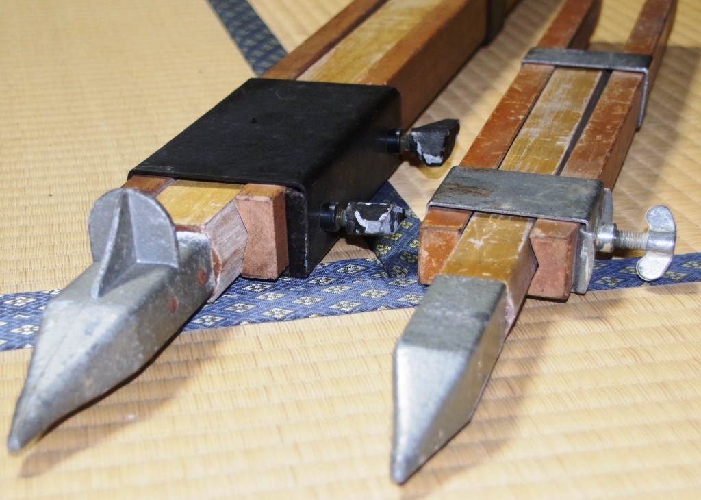 その後ですが、角材を使うようになって小型機、普及機は留めが1か所ですが、外側の材木の内側に溝が掘られ、内側の木材には一番上には両側に溝を沿うような突起(薄い木片を挟む)が設けられていました。断面で見ても横に膨らんだ棒を凹んだ面で抱くようになっていました。角材を挟むだけの当時の他社のものとは違い、一工夫ありました。